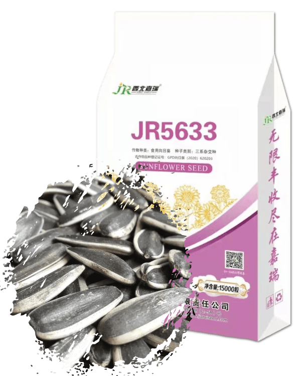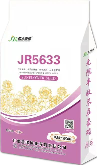 嘉瑞5633属于食用型向日葵杂交种,生育期110天左右,株高210cm左右,茎粗3.2cm,花盘直径24cm左右,籽粒长锥形,该品种耐列当,籽粒主色为黑色,有白色不规则条纹。